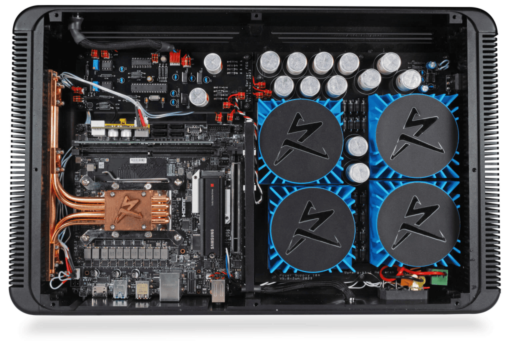When crafting your new Voodoo Streamer/Server, we utilize the same low mechanical resonance chassis architecture as found in other SR Active Components like our Galileo Active Ground Block and UEF Ethernet Switch. We effectively eliminate vibrational feedback between the chassis and the internal circuits by using thick billets of CNC-machined aircraft aluminum and carbon fiber. To ensure cool and quiet operation without noisy fans, the entire chassis acts as a massive heat sink to dissipate the considerable heat generated by its powerful Linux computer. Even the top screens are machined from bronze with a carbon fiber inlay to boost aesthetic beauty as it improves internal cooling, so your Voodoo server is as quiet and sexy as your system’s now nonexistent noise floor.