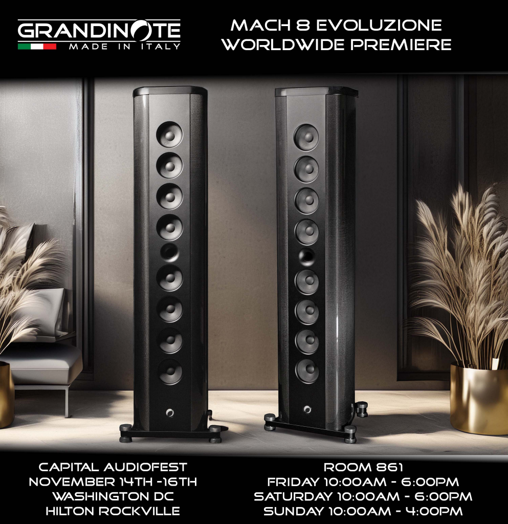 Join Grandinote at Room 861, Capital Audiofest 2025 (Nov 14-16)! Experience the world premiere of Grandinote Mach 8 Evoluzione loudspeakers, crafted with carbon fiber and aluminum, alongside the Grandinote Solo integrated amplifier. Meet our partners Kimber Kable and Audio Compositions.
