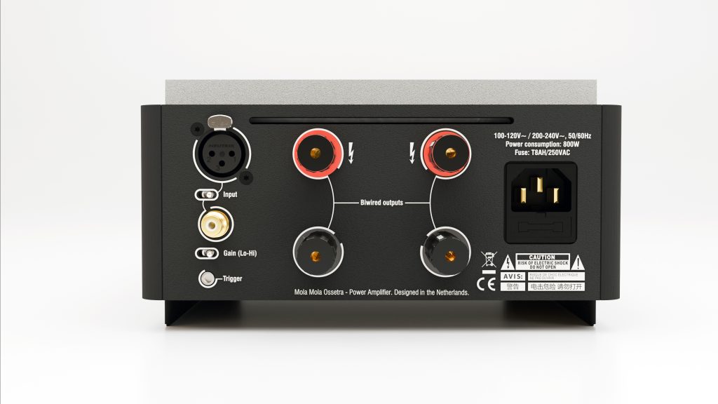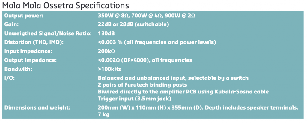 The Mola Mola Ossetra is a 350W/8 Ohm full-bridge amplifier, mono, half size chassis.