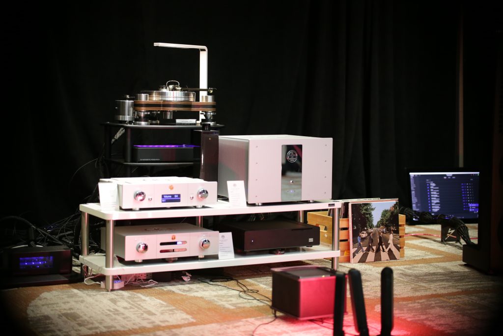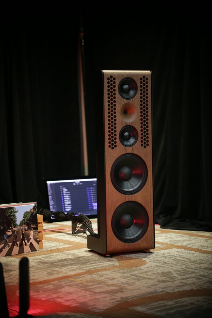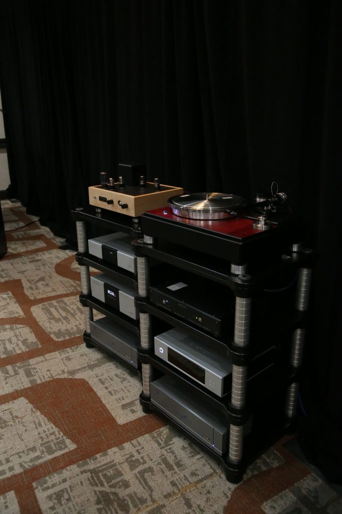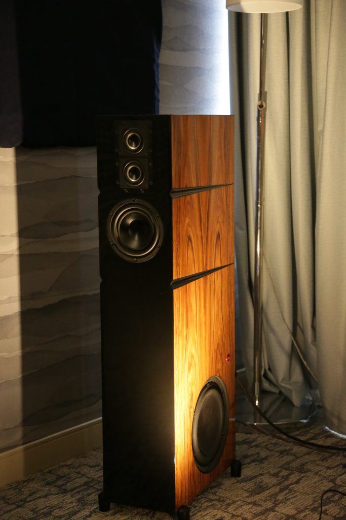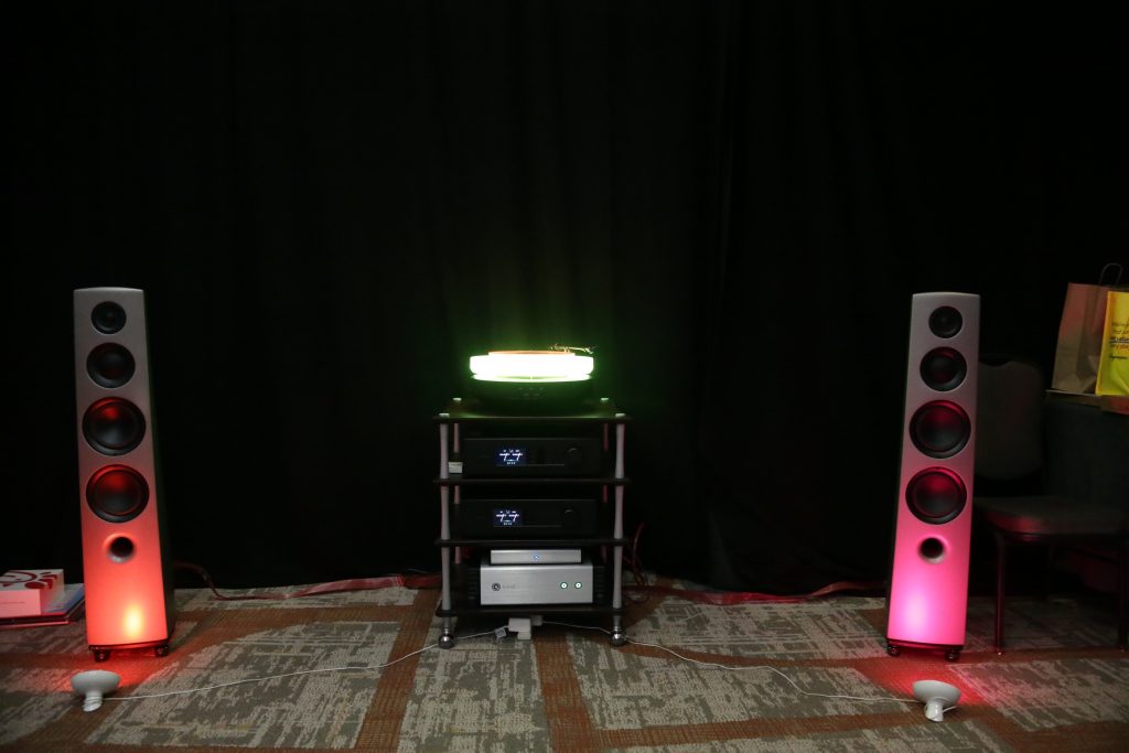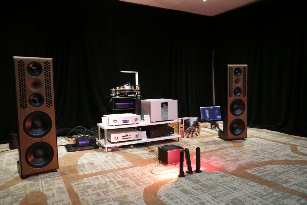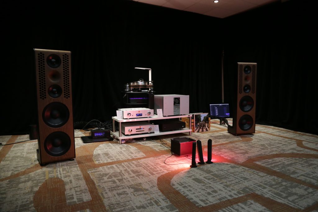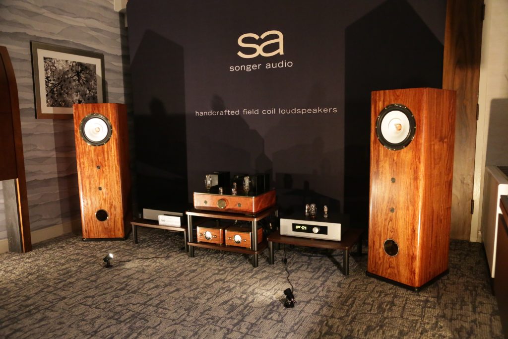 Songer Audio had their full range Field Coil speaker paired with their A3 integrated amplifier and a Lampizator DAC. The room sounded great, and I am not usually a fan of full range speakers, but like anything, implementation makes all the difference. The Songer amp and Speakers had impeccable midrange clarity. The top and low-end were excellent, though I do prefer more punch in the bass, but you can always add a sub if you’re like me. Most of the music you hear lives in the midrange, so having that lush, full, and detailed midrange really sells the speakers.