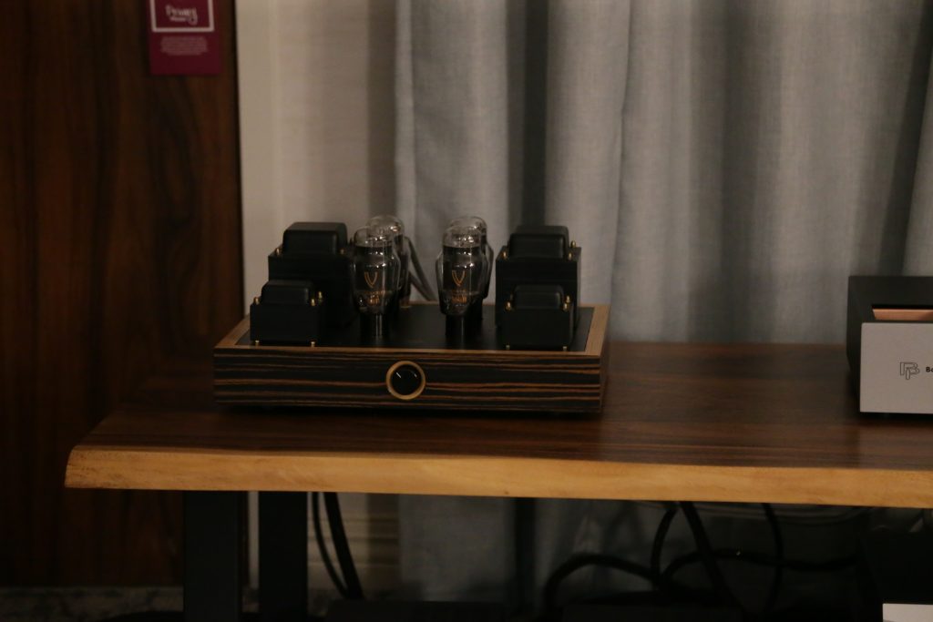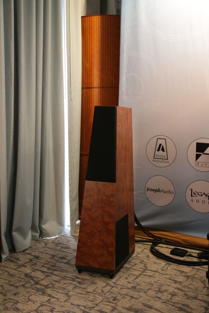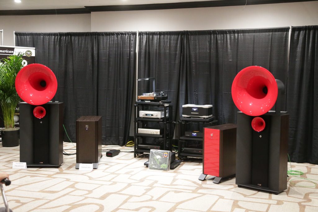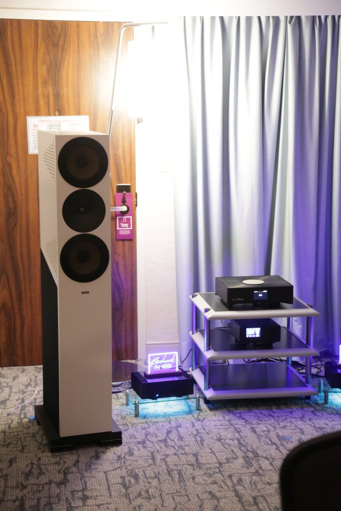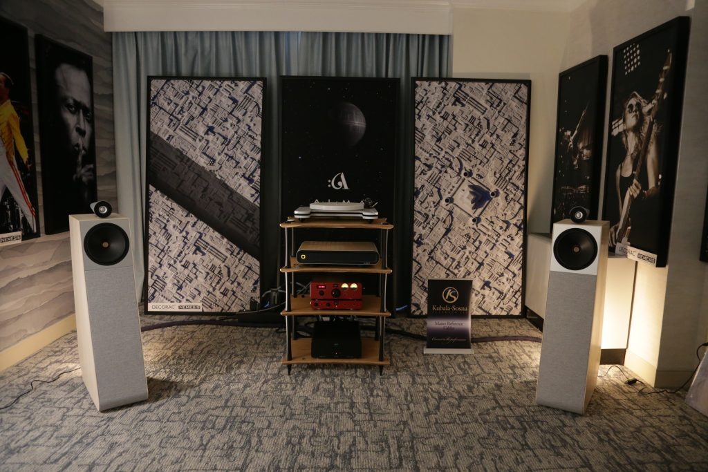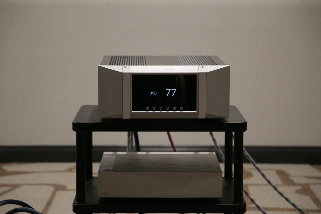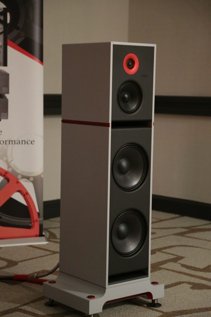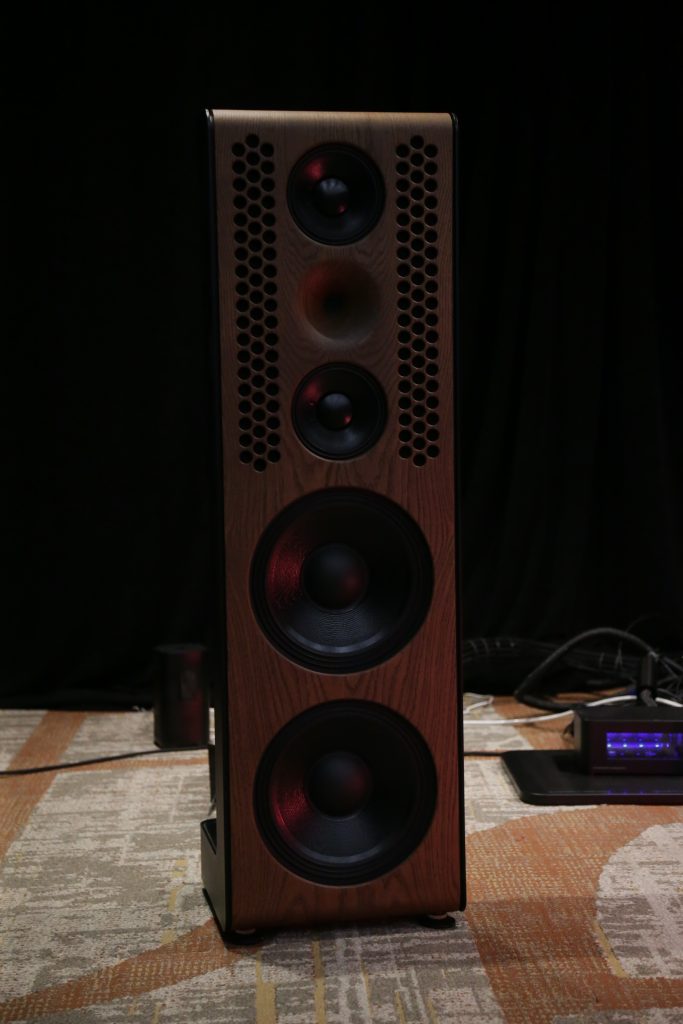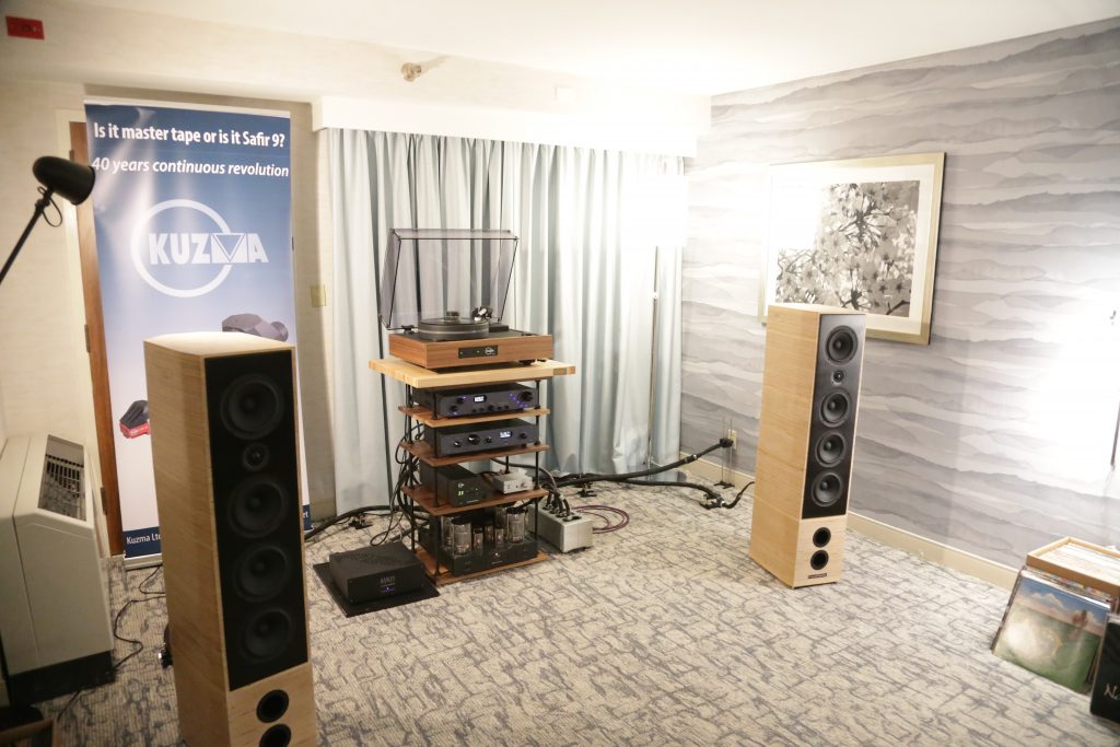 Songer Audio had their full range Field Coil speaker paired with their A3 integrated amplifier and a Lampizator DAC. The room sounded great, and I am not usually a fan of full range speakers, but like anything, implementation makes all the difference. The Songer amp and Speakers had impeccable midrange clarity. The top and low-end were excellent, though I do prefer more punch in the bass, but you can always add a sub if you’re like me. Most of the music you hear lives in the midrange, so having that lush, full, and detailed midrange really sells the speakers.