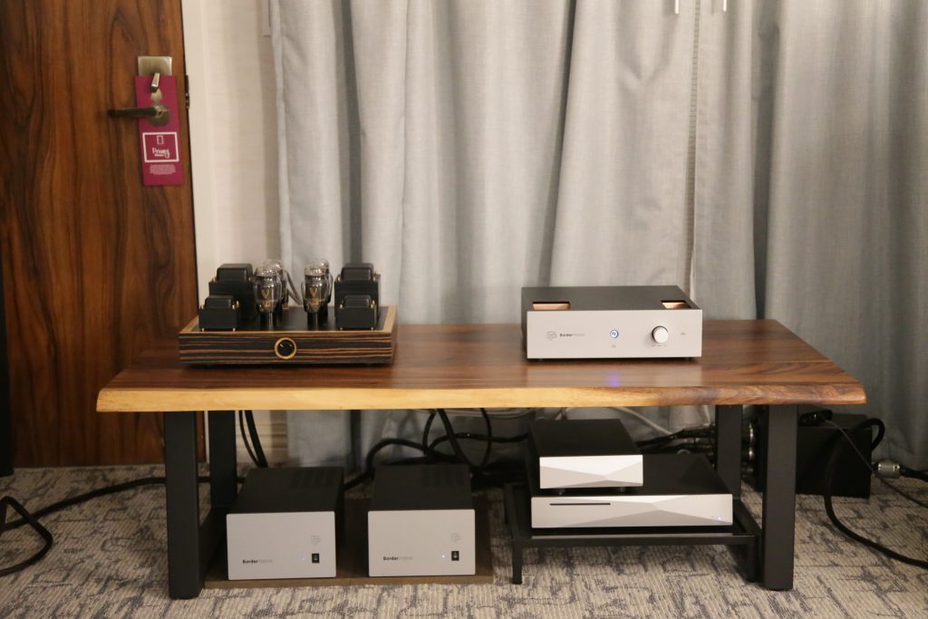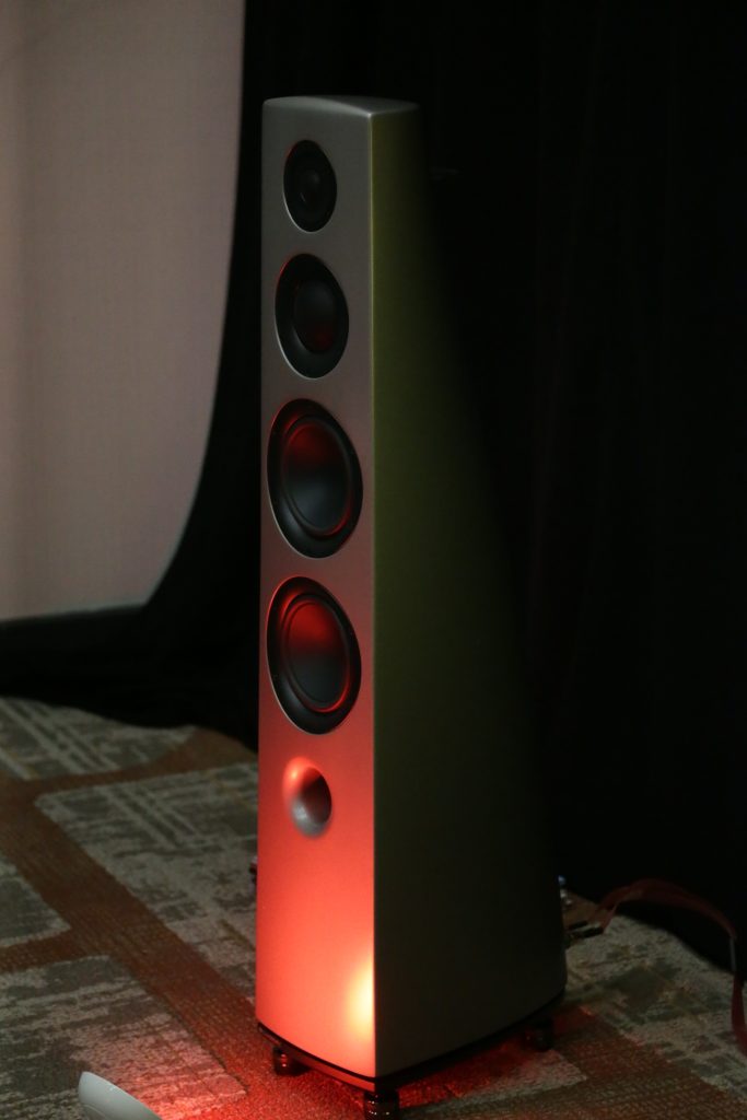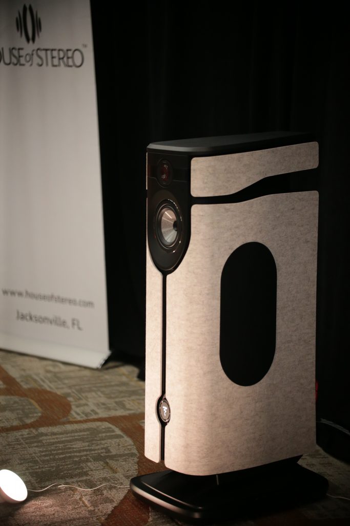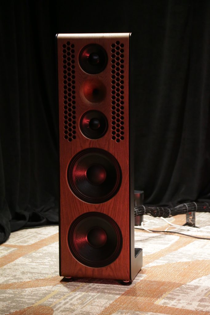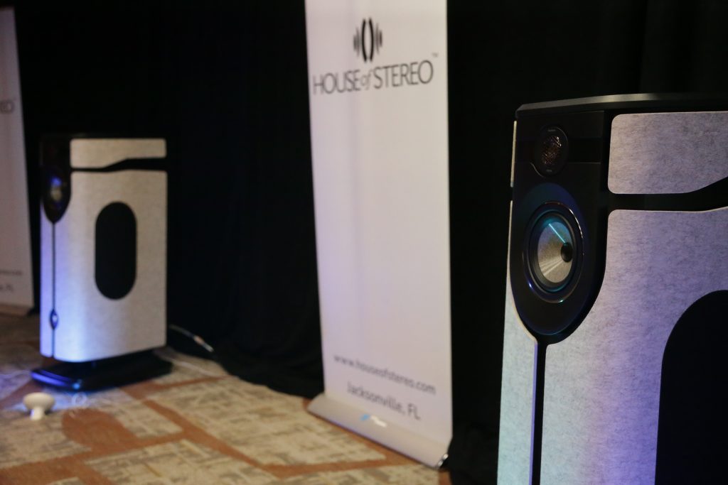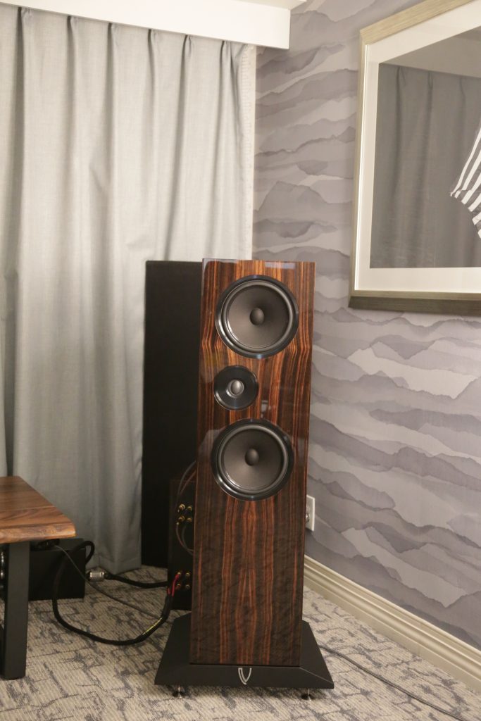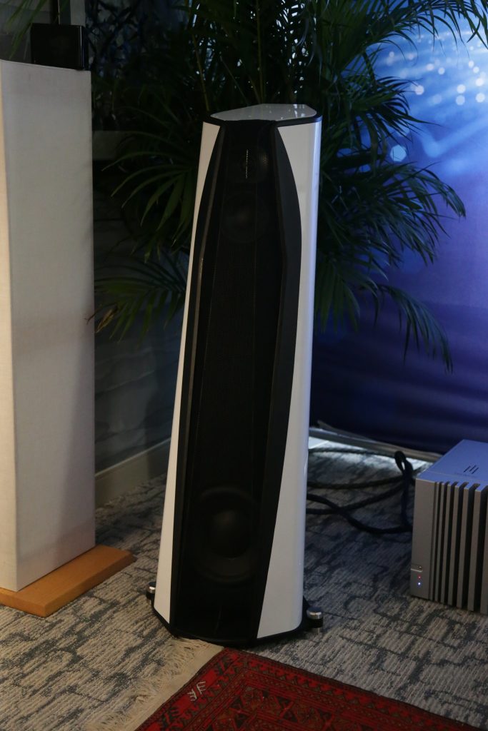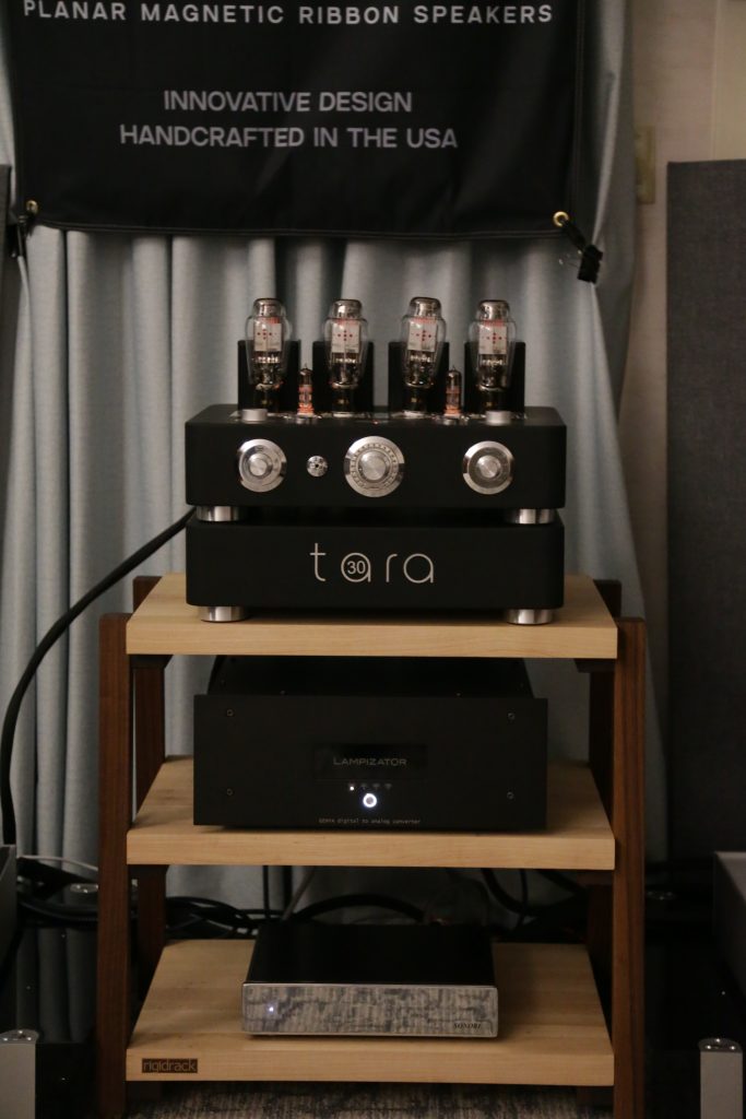 Songer Audio had their full range Field Coil speaker paired with their A3 integrated amplifier and a Lampizator DAC. The room sounded great, and I am not usually a fan of full range speakers, but like anything, implementation makes all the difference. The Songer amp and Speakers had impeccable midrange clarity. The top and low-end were excellent, though I do prefer more punch in the bass, but you can always add a sub if you’re like me. Most of the music you hear lives in the midrange, so having that lush, full, and detailed midrange really sells the speakers.