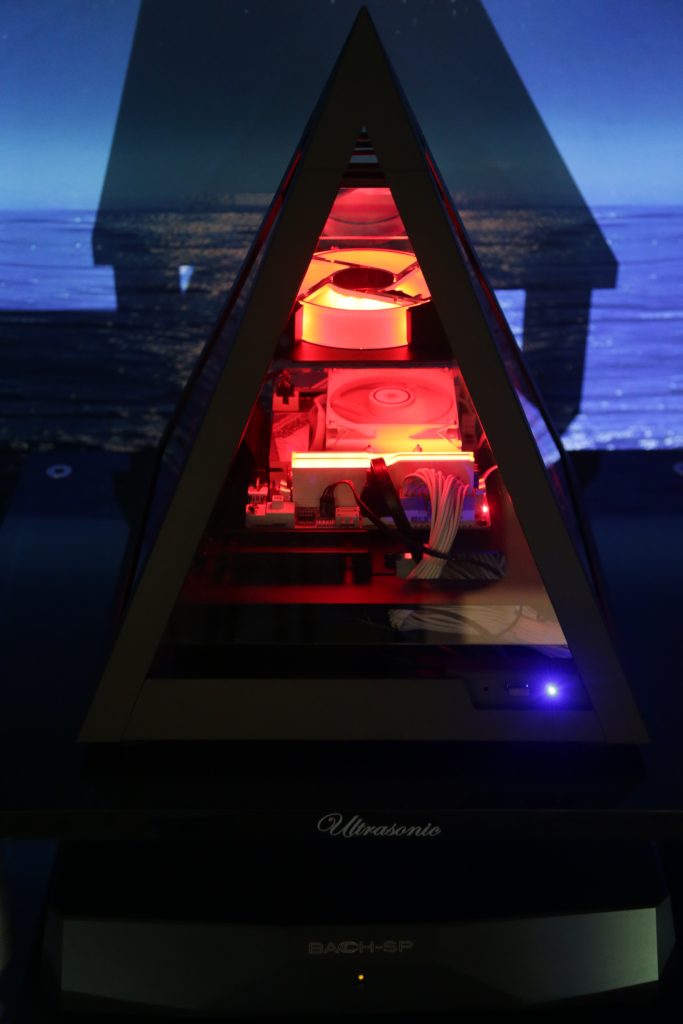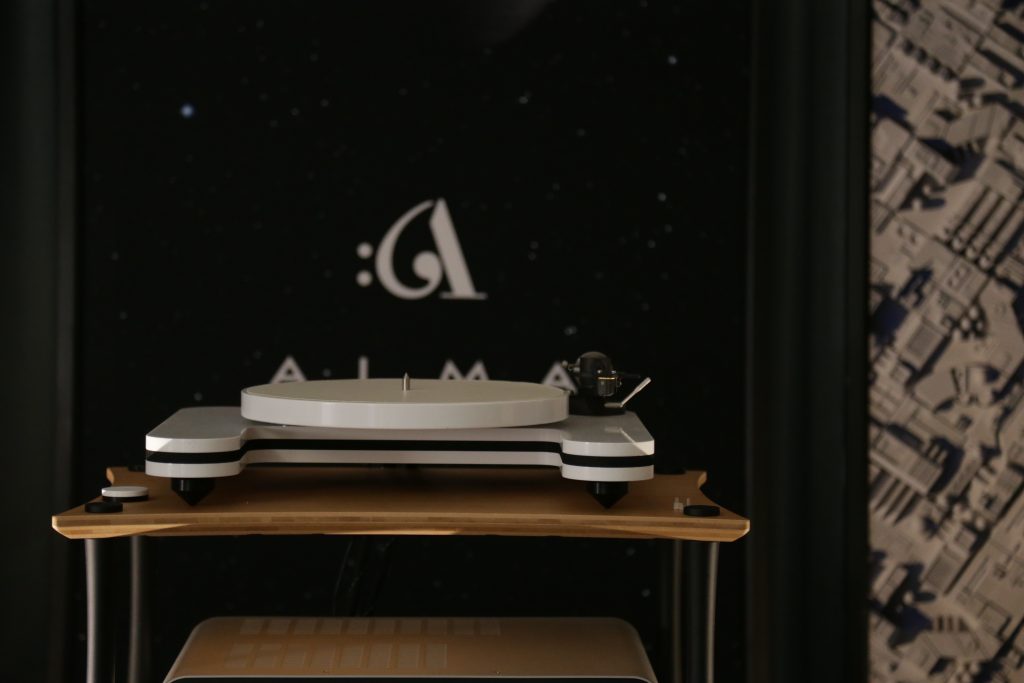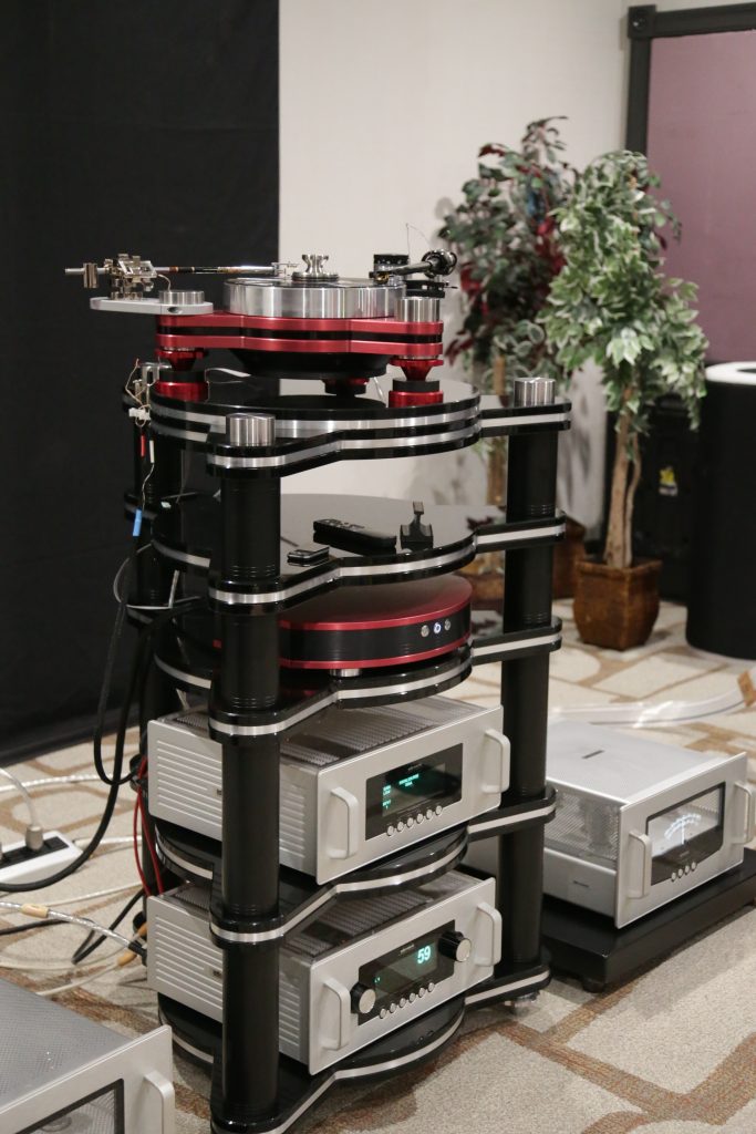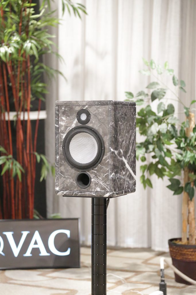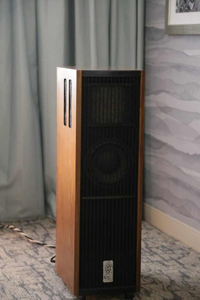 The MC Audiotech Speakers are unlike anything else on the market. Not only in looks, but in construction as well. What you get is a speaker that delivers effortless mids and lows and a perfect amount of top-end sparkle. They are fairly efficient at 91dB, so you can run them off lower-powered tube amps and still get plenty of volume. I’m currently running them off an old Mac MC250 from the sixties, with only 50 watts per channel (rated), and they just sing. Keep your eye out for a full review. But back to the room, I had a great time talking with Mark and finally meeting Itai in person, the combo was beautifully minimalist in components, but maximalist in sound.