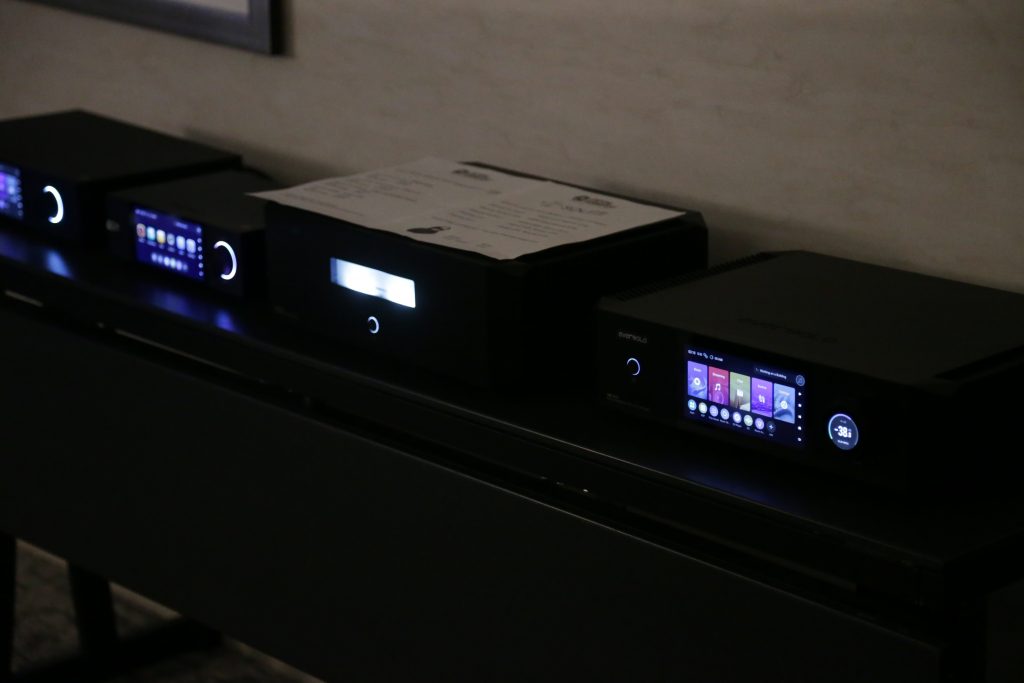 Harmonia had a couple of systems set up; the one I spent time with was fairly simple, comprised of a Prima Luna integrated amp, Pathos DAC and Streamer, and a Pair of Fyne Audio Speakers. The Prima Luna amp used was the Evo 200, which offers 44 watts per channel and several inputs. The Pathos Converto MkII DAC has a fully balanced analog stage and offers up a clean signal for the tubes in the Evo 200 to amplify and send to the Fyne F502S with Fyne’s Super Tweeter on top. Sean (Smo) played a variety of music for us, including a great cover of Kid Cudi’s Pursuit of Happiness, then I played Colors (orchestral) by Halsey. Both Tracks sounded great on the system, but beyond that, the bond we made over sharing and listening to music shows how powerful this hobby can be. It goes beyond the systems, but without them, we may not be able to enjoy the music and connection as much as we do. It was a great room with some great music and people.